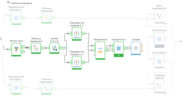 Добрый день! Как обойти ограничение выхода на следующую итерацию из ветвей цикла? Цикл работает по подмодели, внутри которой есть Узел Условие. Условие следующее: если сумма по столбцу более или равно 1 , то выгрузи файл xlsx и выйди в цикл, если меньше 1, то файл txt и выйди в цикл.